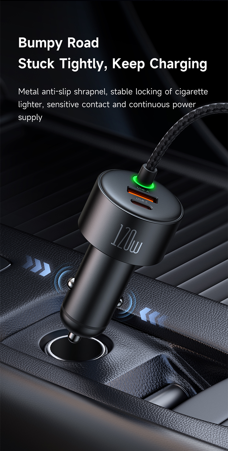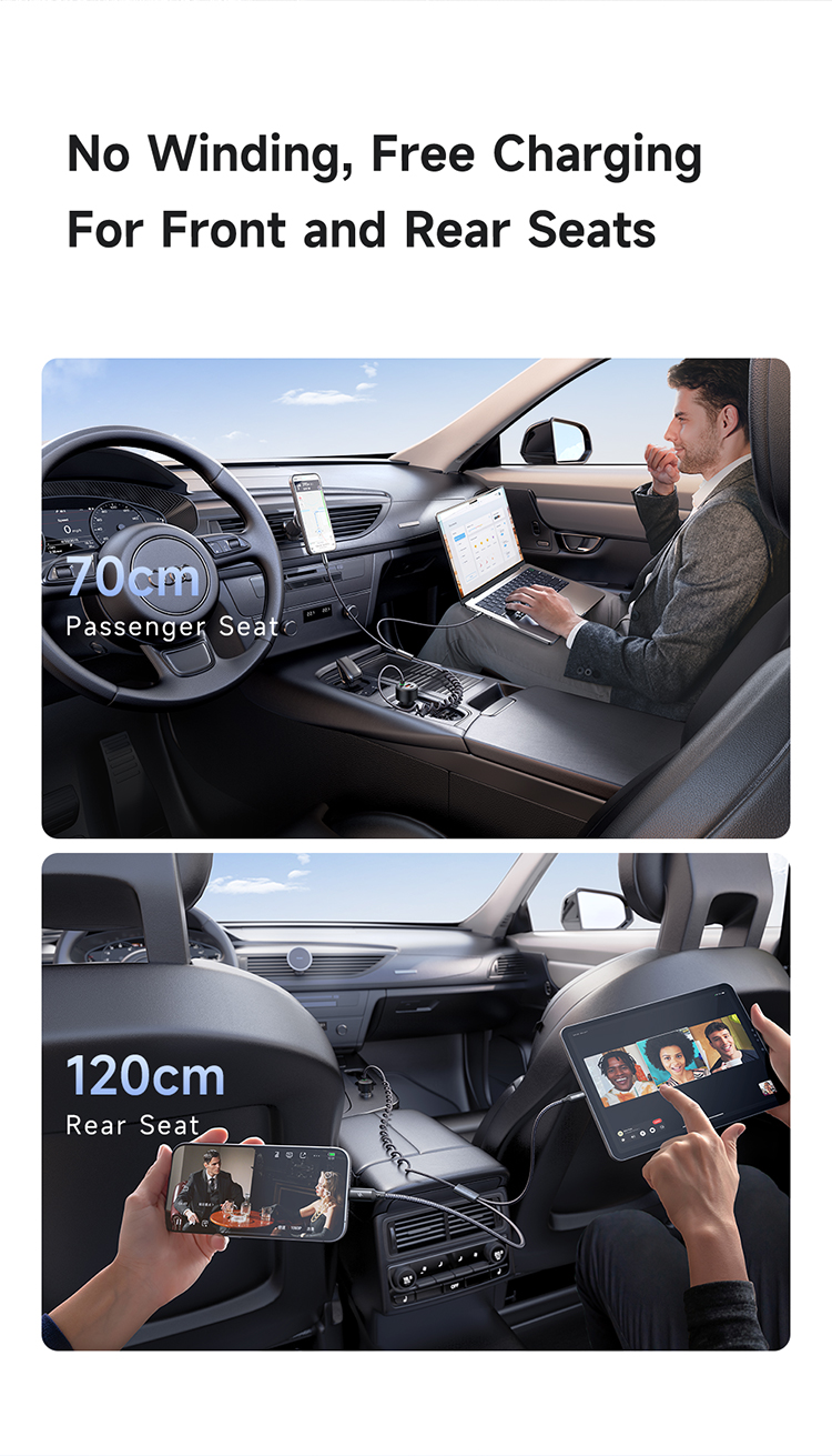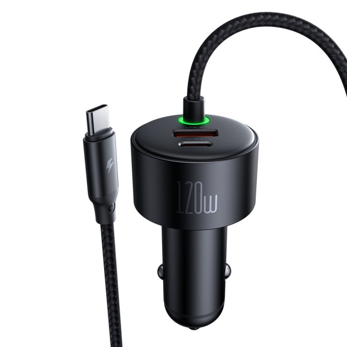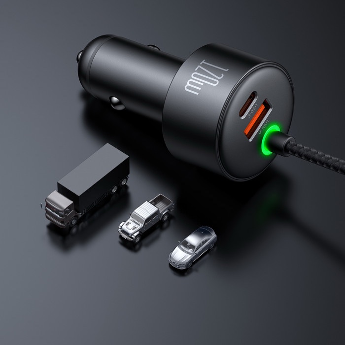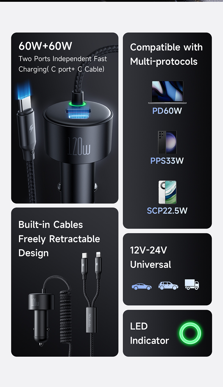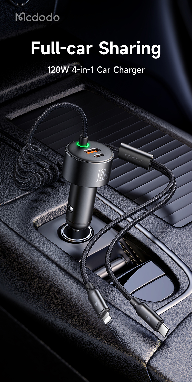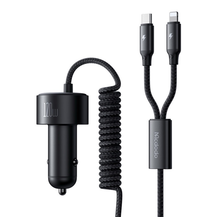 MCDODO CC0370 120W 1C+1A CAR CHARGER WITH USB-C AND LIGHTING RETRACTABLE CABLES – BLACK