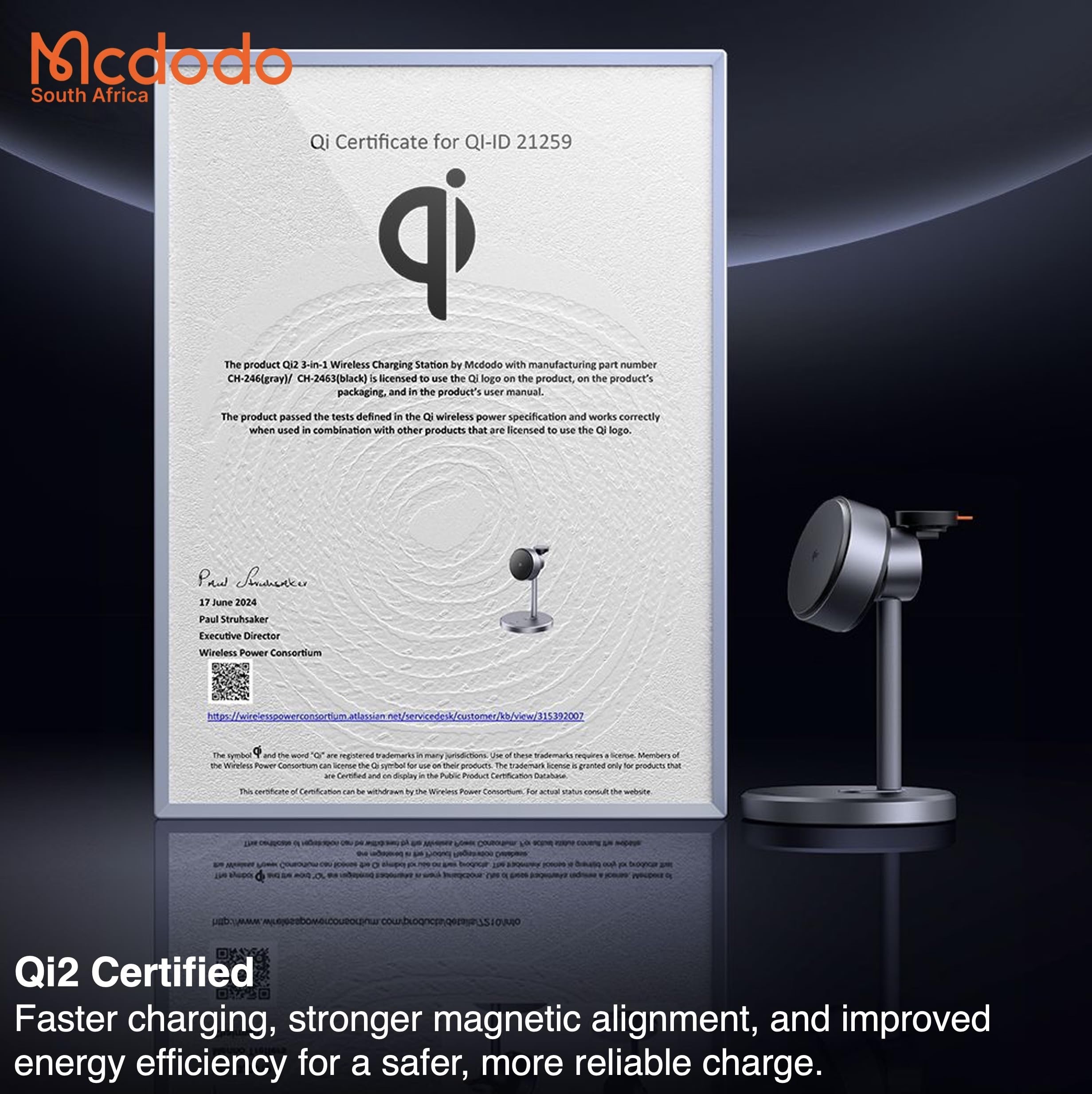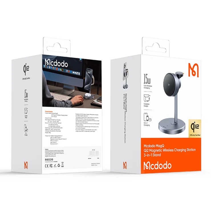 MCDODO CH-2462 MagQ Qi2 Wireless Charger with EU Plug Adapter, 3-in-1 Charging Station Stand – Black