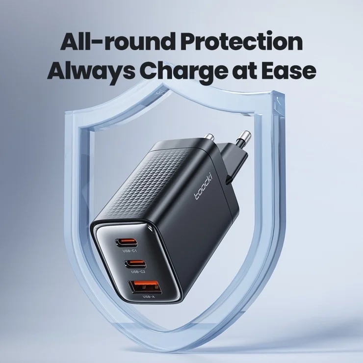 TOOCKI TCT65 65W Wall Charger 2C1A Fast Charging Multi Port USB C Power Adapter – Black / EU Plug